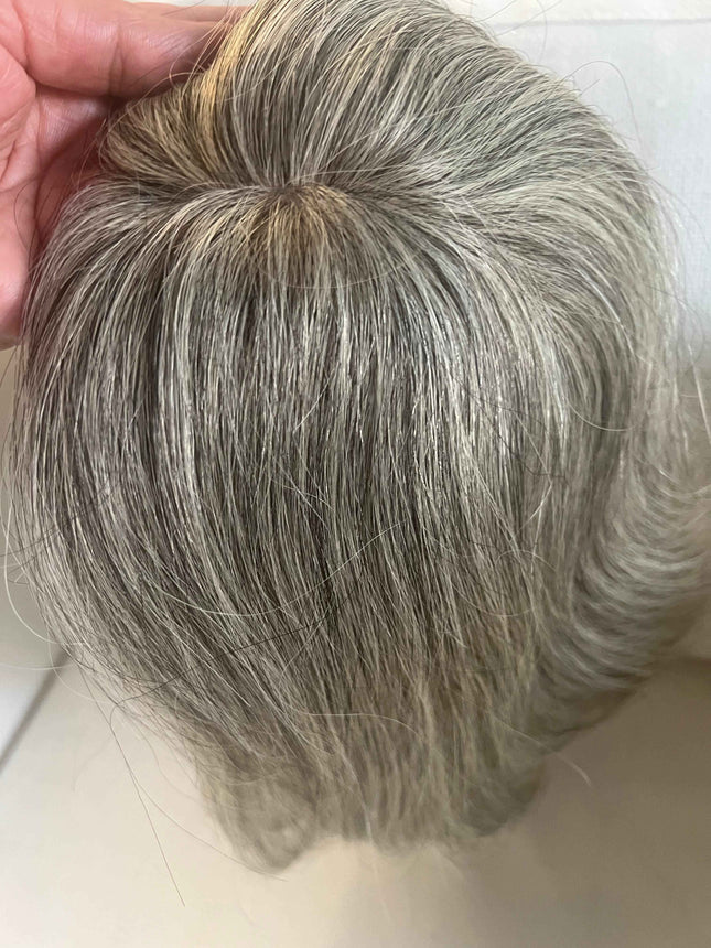 Grey hair topper has remy human hair with grey salt and  blonde grey with pale white thinning crown .These products are made of 100% human hair for a natural and realistic look. Our selection offers a variety of styles, textures, and colors like salt and pepper blonde, grey, and pale white. With lace toppers and winglets available, you can find the ideal hair piece to complete your hairstyle. Shop our collection for hair pieces and winglets to find the perfect look. 100%human hair clip-in topper with 3x4 base Salt and pepper blonde grey with yellowish white mixed hair shade. Made from high-quality human hair, this topper is designed to perfectly blend in with your natural hair, providing you with a fuller and more voluminous look. Breathable clip in baseThe topper features natural-looking pale white blonde grey mix , which add depth and dimension to your hair, giving you a sun-kissed and radiant look. The clip-in design makes it incredibly easy to attach, and the topper can be styled in any way you desire.This human hair clip-in topper is perfect for anyone looking to add volume and length to their hair or those