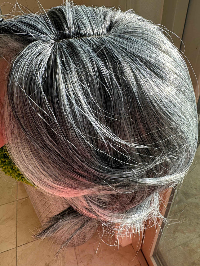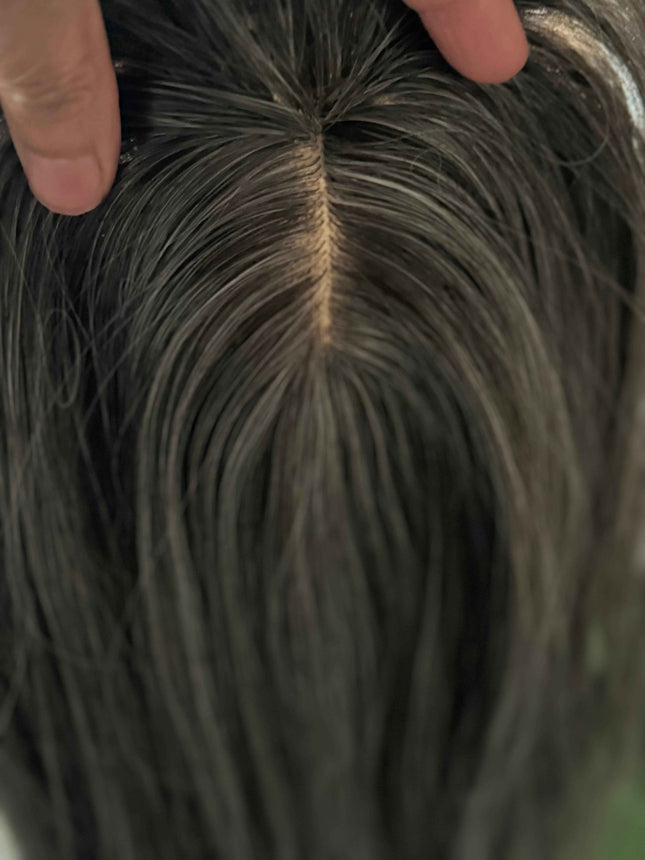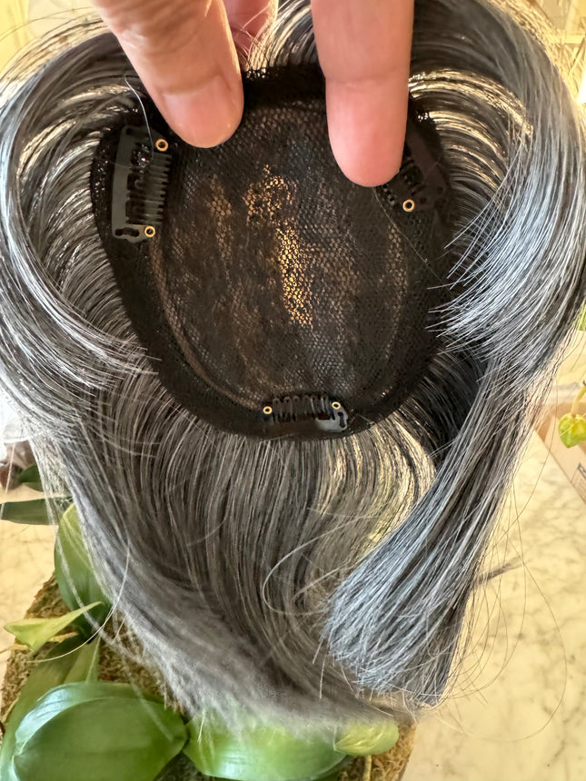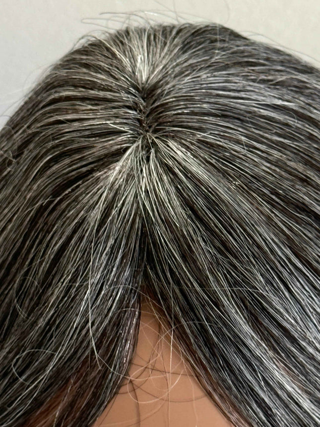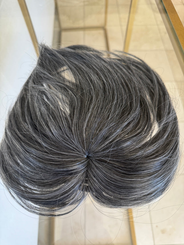 Introducing our latest addition to our hair topper , the Human Hair Silver Grey Salt and Pepper Hair Topper for Women's Thin Crown Hair. This hair topper with front bangs is the perfect solution for women experiencing hair loss or thinning on the crown area of their head.Made from high-quality real human hair, this topper is designed to blend seamlessly with your natural hair, giving you a natural and beautiful look. The silver grey salt and pepper color adds a touch of sophistication and elegance, making it perfect for any occasion.The topper is easy to apply and secure, thanks to its breathable and comfortable base. It comes with four pressure-sensitive clips that can be easily attached to your existing hair, ensuring a secure fit that won't slip or move throughout the day.With its versatile style, you can easily customize your look by trimming the topper to your desired length and style. It's heat-friendly, so you can use your favorite styling tools to create the perfect look, whether it's straight and sleek or curly and voluminous.Say goodbye to bad hair days and hello to a beautiful and confident you with our Human Hair Silver Grey Salt and Pepper Hair Topper for Women's Thin Crown Hair.