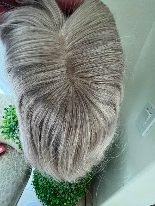 Human Hair Toppers for Women real part silk base Light Blonde Mix highlight Hair Loss thinning crown short hair topper casual hair part hair updo ntroducing our beautiful human hair topper designed for women experiencing hair loss. Made with the finest quality human hair, this topper features a stunning light blonde mix that looks incredibly natural and will blend seamlessly with your own hair.The topper is designed to cover any areas of hair loss, giving you the confidence you need to face the world. It's perfect for women with thinning hair or those experiencing hair loss due to medical conditions or treatments.The topper is incredibly easy to attach and can be styled just like your natural hair. The high-quality human hair is soft and silky, ensuring it's comfortable to wear all day long.The light blonde mix adds depth and dimension to your hair, creating a natural-looking effect that's both stunning and subtle. The topper is available in various lengths, allowing you to choose the perfect length to suit your style.Our human hair topper is perfect for anyone looking to add volume and thickness to their hair, or those who want to cover up any thinning spots. The natural-looking light blonde mix shade is incredibly versatile and will complement any skin tone. This hair topper is used for short hair styles and new hairdo