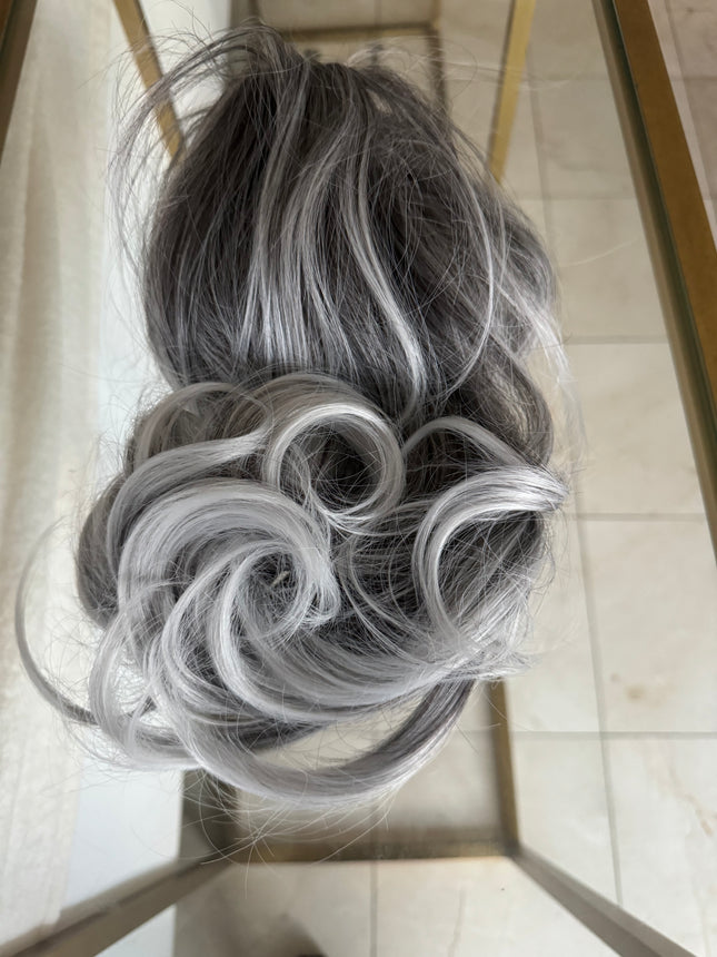 • Tillstyle grey elastic hairbun scrunchie with bangs grey pony tail extension  with white ends Tillstyle grey elastic hairbun scrunchie with bangs grey pony tail extension  with white ends