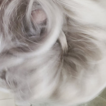 This Tillstyle white silver salt and pepper brown blonde grey with white hair creamy white ends messy hair bun curly... Read more