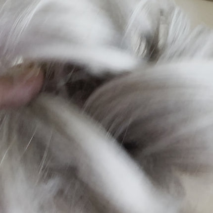 This Tillstyle white silver grey salt and pepper blonde grey with white hair creamy white ends messy hair bun curly... Read more