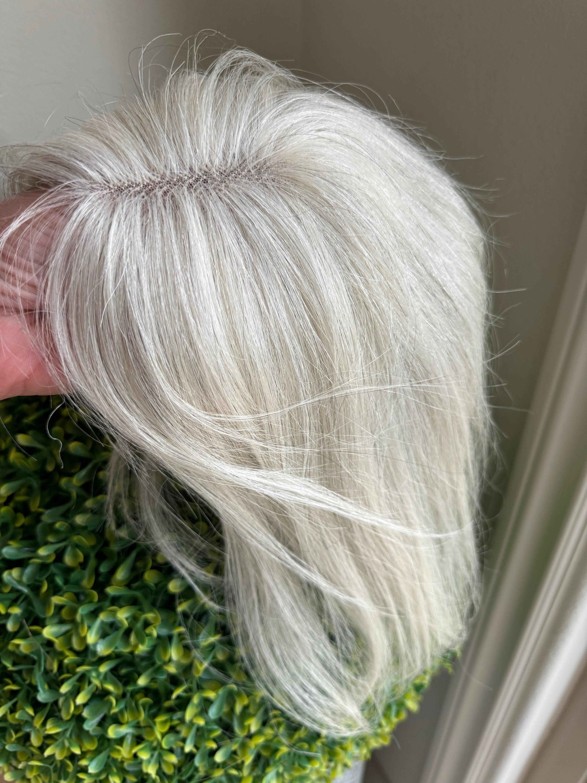 White human hair Topper with 5x4.8 base size covers larger area of hair loss.pale white topper is 12 inch in length .This hair topper is light weight is for thinning crown .Natural white clip in hair topper is easy to apply hair piece for alopecia medium hair styles for every day wear / casual hair style or can be gift at any occasion